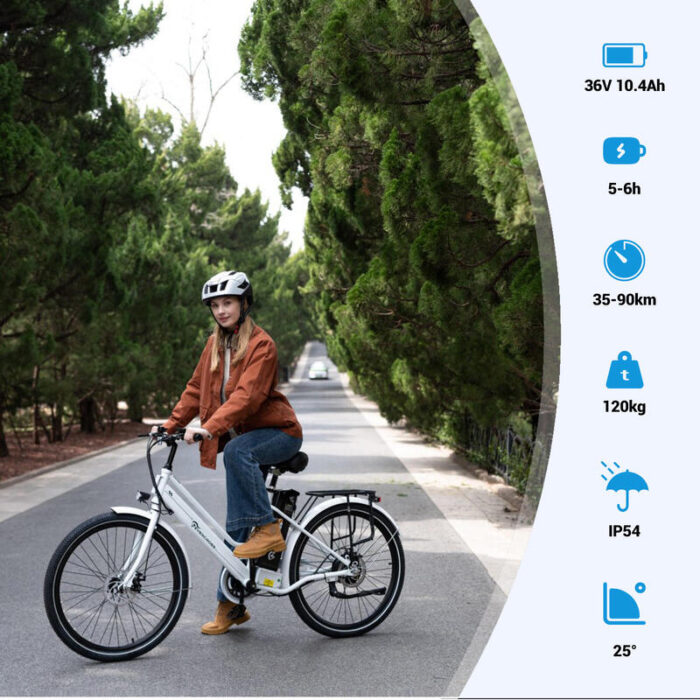 **Excellentes Performances: **Ce vélo électrique a une apparence simple et magnifique.Il est spécialment destiné pour les amateurs de sport et les salariés.Ce vélo électrique est équipée d’un moteur de 250 W, d’une batterie de 36v et 10.4 Ah et 3 modes de conduite. La vitesse maximale peut atteindre 25 km/h, l’autonomie est de 35 km, charge maximale atteint 120KG. Pneus pleins de 26 pouces, le cadre en fer léger et la longue durée de la batterie sont les particularités de ce vélo électrique.