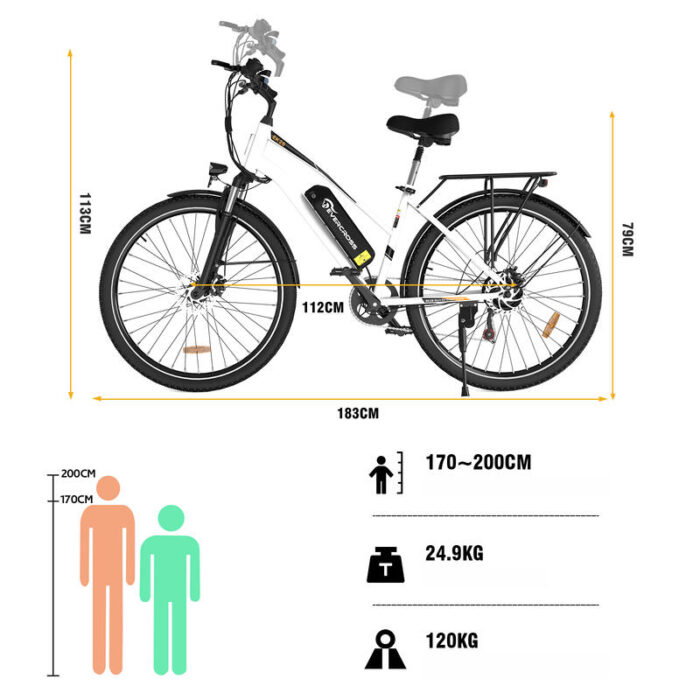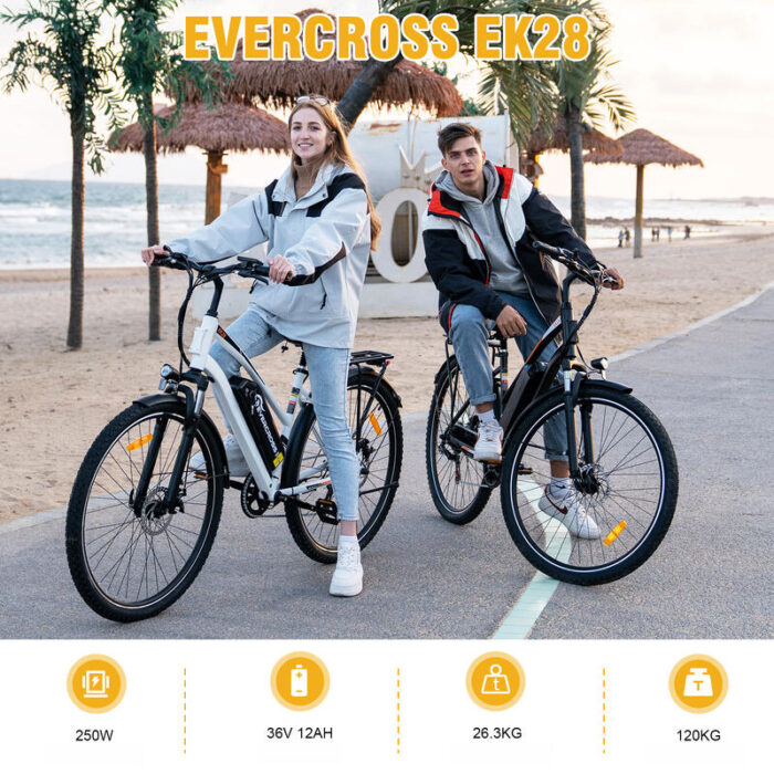 EVERCROSS EK28 – Votre nouveau compagnon de voyage – confortable et ergonomique – grâce à des pneus 28″*2.0, batterie amovible, moteur brushless 250W, fourche à suspension, freins à disque.