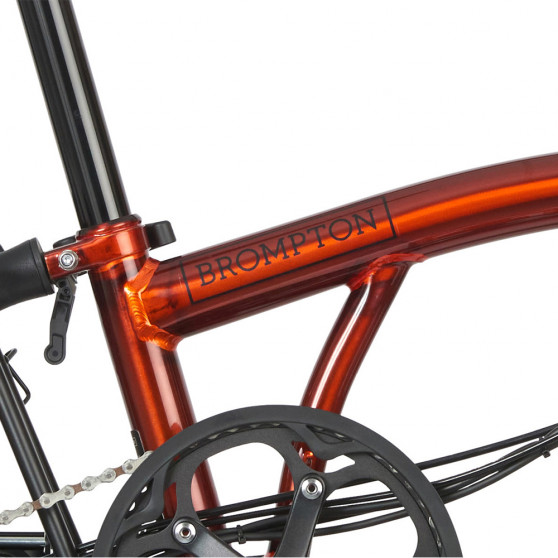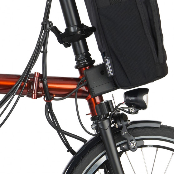 Cadre en acier traité thermiquement et brasé à la main (triangle avant), cadre en acier micro-allié brasé à froid (triangle arrière) – manettes de serrage en composite – avec pompe Brompton – bloc de fixation avant pour sacoche-batterie