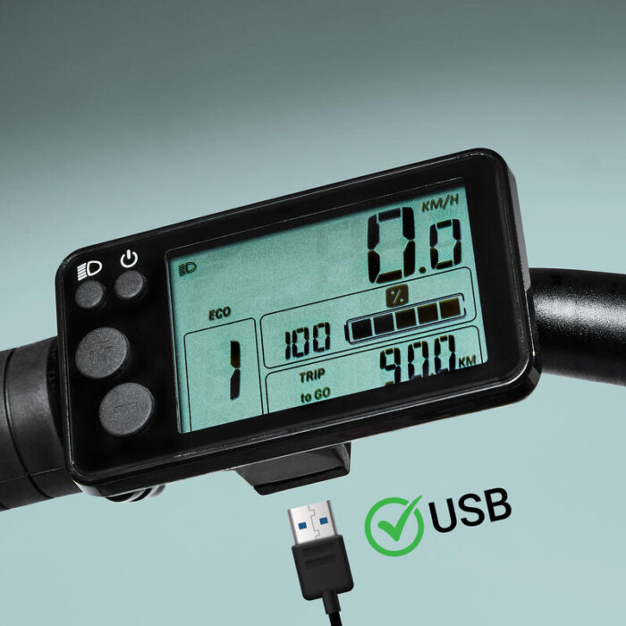 Affichage de : la vitesse, le temps et les distances parcourues et totales, l’autonomie restante et le mode.