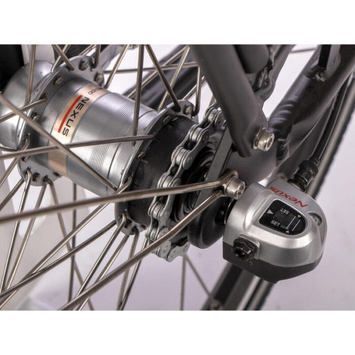 Peut être chargée séparément et sur le vélo. Chargeur fourni. - 3 vitesses dérailleur NEXUS intégré au moyeu arrière, levier de vitesses Shimano