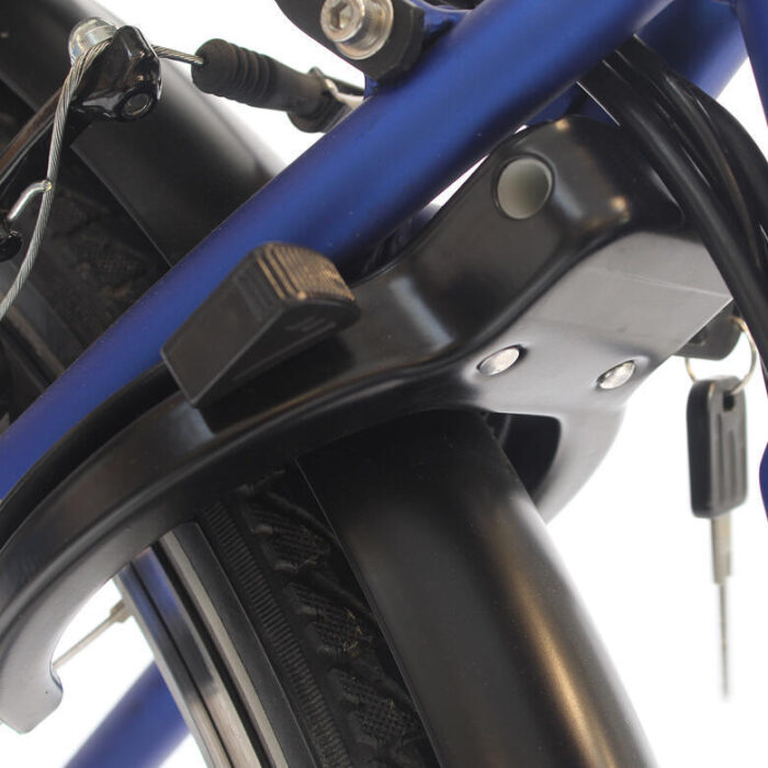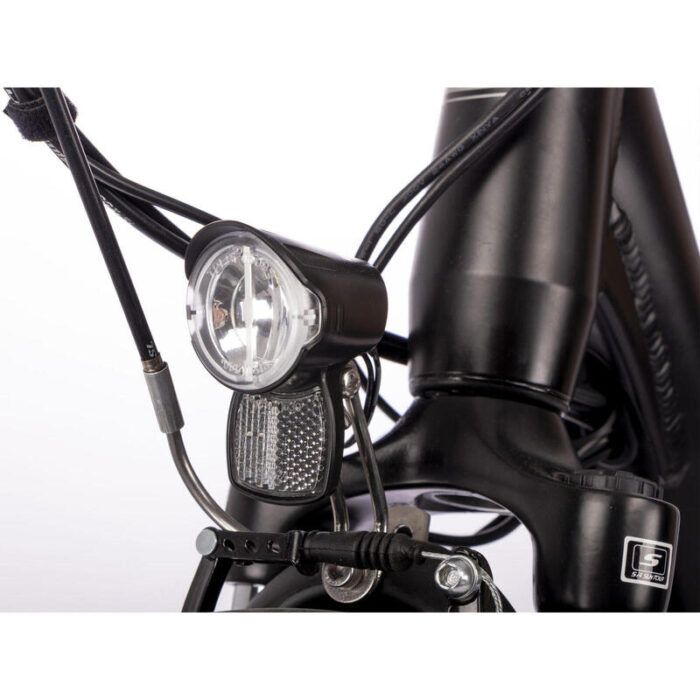 Performant : Roues 28” Moteur 250W, 25kmh, Batterie 374Wh 10.4Ah, 50-60 km d’autonomie + Confortable : fourche suspendue avant 3 vitesses Shimano, cadenas de cadre, porte bagages.